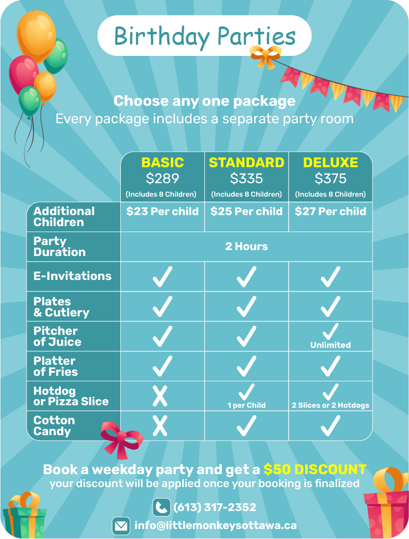 You can book your party online or contact us via phone at 613-317-2352 or by email at [email protected].